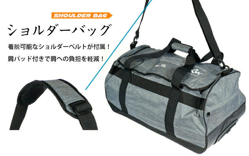 ※バッグは完全防水ではありません 「積載耐荷重50Kg」 底面ガード採用 厚さ1.5cmの丈夫なガード板を採用し 床に直置きしても型くずれが起きにくく 置き場所を選びません! 「積載量 大容量70L」 長期の旅行にも使える大容量。