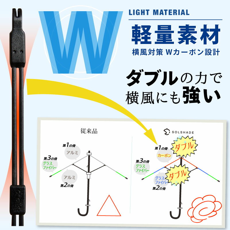 一般的な傘はアルミを使用する箇所に軽量で硬度が高いカーボンを取り入れることで強化。