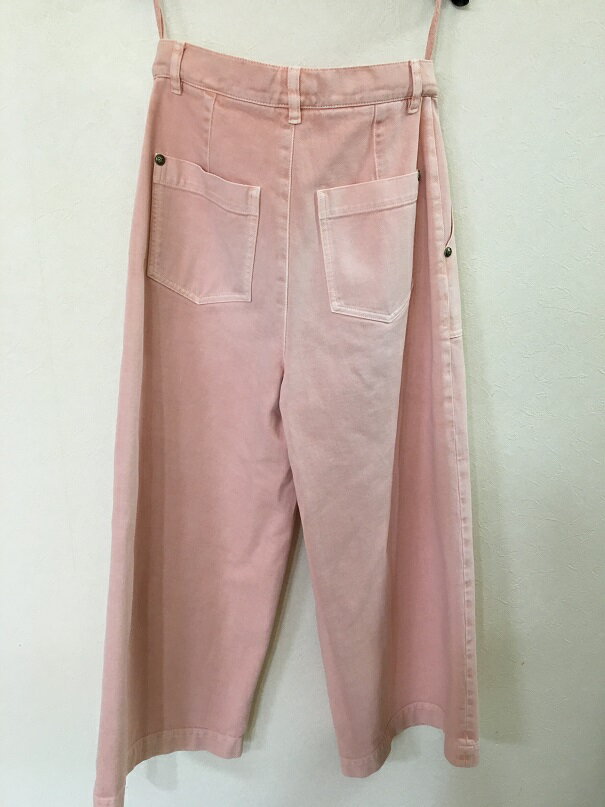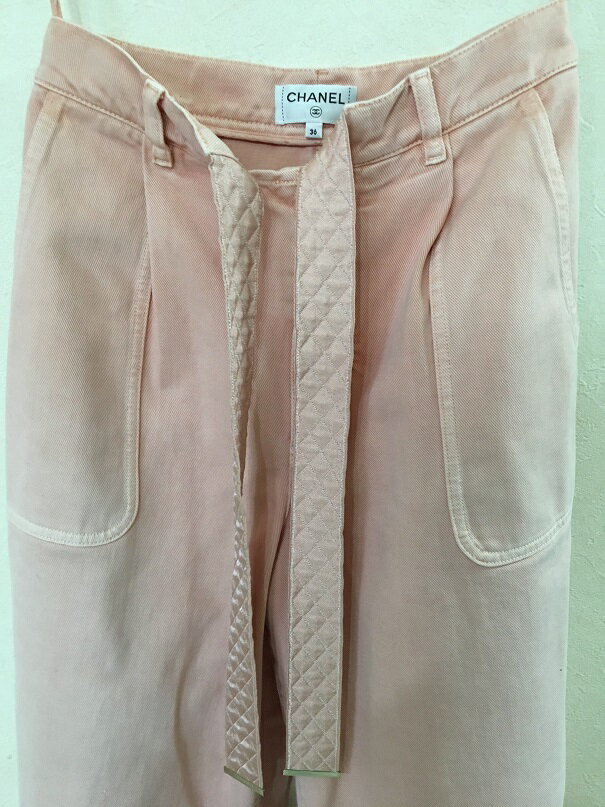 シャネル 18P春夏ココマークマトラッセリボンつきワイドデニムパンツ 色目 オーラルピンク系 サイズ 36ウエスト平置き34 股上32 股下63 ワタリ33 スソ幅平置き31センチ程度 もともと短めのワイドパンツです。