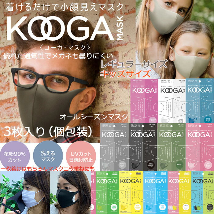 【あす楽 在庫あり】 KOOGA MASK コーガ ウレタンマスク 3枚入り 洗える ポリウレタンマスク 男女兼用 レギュラーサイズ kid 子供マスク 立体マスク 蒸れない 収縮性抜群 吸水速乾 UVカット 花粉 スポーツマスク 個包装 ふつうサイズ 涼しい 二枚重ね 2枚 2重 着け